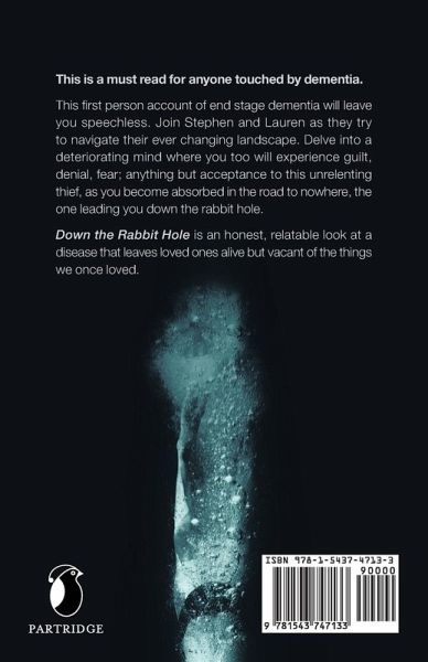 This is a must read for anyone touched by dementia. This first person account of end stage dementia will leave you speechless. Join Stephen and Lauren as they try to navigate their ever changing landscape. Delve into a deteriorating mind where you too will experience guilt, denial, fear; anything but acceptance to this unrelenting thief, as you become absorbed in the road to nowhere, the one leading you down the rabbit hole. Down the Rabbit Hole is an honest, relatable look at a disease that leaves loved ones alive but vacant of the things we once loved.
