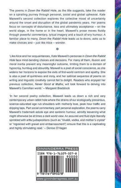 The poems in Down the Rabbit Hole, as the title suggests, take the reader on a spiralling journey through personal, social and global upheaval. Kate Maxwell's second collection explores the collective mood of uncertainty around the onset and disruption of the global pandemic years. Her poems focus on concepts of disturbance, loss and ultimately acceptance - on the world stage, in the home or in the heart. Maxwell's prose moves fluidly through powerful commentary, lyrical imagery and a touch of wry humour. A familiar place to many, Down the Rabbit Hole, leads us to doors, asks us to make choices and - just like Alice - wonder. 'Like Alice and her acquaintances, Kate Maxwell's personae in Down the Rabbit Hole face mind-bending choices and decisions. For many of them, illusion and moral inertia prevent any meaningful outcome, limiting them to a domain of hypocrisy, humbug and absurdity. Maxwell is a poet of social conscience, as she widens her horizons to expose the evils of first-world centrism and apathy. She is also a poet of quirkiness and irony, and her satirical sequence of poems on writing and linguistic creativity cannot fail to delight. Readers who've enjoyed her previous collection, Never Good at Maths, will look forward to delving into Maxwell's Carrollian world.' - Margaret Bradstock 'In her second poetry collection, Maxwell leads us down a rich and very contemporary urban rabbit hole where the strains of our ecologically precarious, science-saturated age rub shoulders with motherly love, peak hour traffic and dripping taps. Part social commentary, part personal exploration, the poems carry Maxwell's trademark astute eye and sardonic humour, adroitly leavening what might otherwise be at times a dark world view. An assured and fluid style liberally sprinkled with artful juxtapositions (such as "Vivaldi, vodka, and mother's crystal" or "ingrained with gravel and embarrassment") ensure that this is a captivating and highly stimulating read.' - Denise O'Hagan