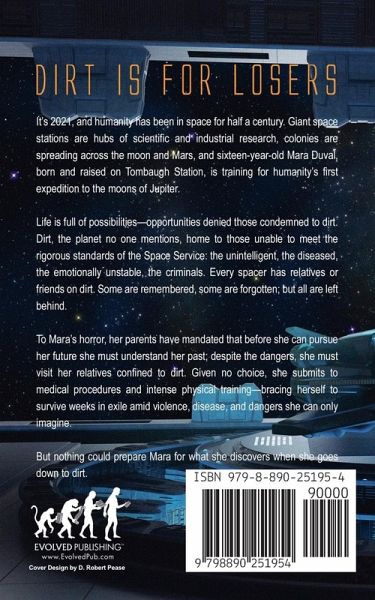 Dirt is for losers. "DOWN TO DIRT is YA hard science fiction with an attitude, full of technical details as engaging as the characters. I was immediately drawn into the story." ~ Kevin J. Anderson, New York Times bestselling author of ETERNITY'S MIND It's 2021, and humanity has been in space for half a century. Giant space stations are hubs of scientific and industrial research, colonies are spreading across the moon and Mars, and sixteen-year-old Mara Duval, born and raised on Tombaugh Station, is training to be part of humanity's first mission to the moons of Jupiter. Life is full of possibilities-opportunities denied those deemed unfit for life in space. The unintelligent, the diseased, the mentally unstable, and the criminal-all who have been rejected by the Space Service-are condemned to live their lives on dirt, a planet everyone knows but no one mentions. Every spacer has relatives on dirt, family members who failed to qualify for space. Some are remembered, some are forgotten; but all are left behind. To Mara's horror, her parents have mandated she understand her past before she can pursue her future. If she wants to follow her dream to Jupiter, she must leave the safety of space and get to know her uncle, aunt, and cousin confined to dirt. Given no choice, she submits to medical procedures and intense physical training-bracing herself to survive weeks of exile amid violence, disease, and dangers she can only imagine. But nothing could prepare Mara for what she discovers when she goes down to dirt. EVOLVED PUBLISHING PRESENTS the first book in this critically acclaimed, timely, young adult science fiction adventure that's sure to keep you riveted.