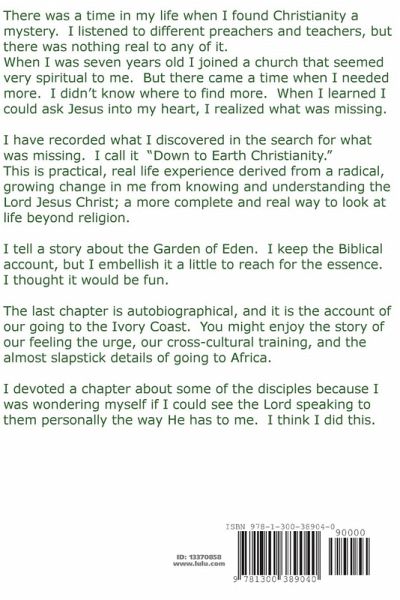 There was a time in my life when I found Christianity a mystery. I listened to different preachers and teachers, but there was nothing real to any of it. When I was seven years old I joined a church that seemed very spiritual to me. But there came a time when I needed more. I didn't know where to find more. When I learned I could ask Jesus into my heart, I realized what was missing. I have recorded what I discovered in the search for what was missing. I call it "Down to Earth Christianity." This is practical, real life experience derived from a radical, growing change in me from knowing and understanding the Lord Jesus Christ; a more complete and real way to look at life beyond religion.