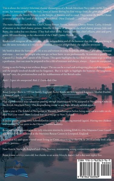 This is about the (mostly) hilarious, clumsy shenanigans of a British Merchant Navy cadet on his first trip to sea. An innocent lad from the leafy lanes of Surrey during his first voyage from the grim docklands of London, across the North Atlantic to the Jungles of Panama and its canal. Then across the Pacific Ocean to several ports in the Land of the Long White cloud. (New Zealand) and back again. The main characters include me, Chief Clumsy Person. Steven, Assistant Clumsy Person. Cathy, A female of interest to the chief clumsy person. Morella, A female of interest to the chief clumsy person. JoJo and Barry, also cadets but not clumsy. (They had other skills). Various captains, chief officers, crew and party goers. All contributing to the education of the Chief Clumsy Person Readers will recognise all the mistakes, all the awkwardness and all the humour that the characters bring is just the same nowadays as it was in the nineteen seventies and probably the eighteen seventies! My book is about the humour of a life at sea and written in a way, hopefully, that everybody can understand and enjoy¿ not just the people who now go, or have been, to sea professionally. It contains a quote from Captain E.J. Smith, the Captain of the Titanic. This quote highlights the fact that if one wants to go to sea as a profession, then one must be prepared to live a life of extremes and always, always ... Expect the unexpected. Going to sea for living is not without danger. The sea can be a cruel and unforgiving place and the tragedies and the people involved should not be forgotten. But it is right to highlight the humour, the toughness, the resilience, the professionalism and the stubbornness of the British sailor. Rule1. Expect the unexpected. Rule 2. Learn Rule One