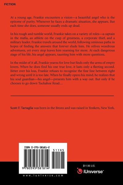 At a young age, Frankie encounters a vision-a beautiful angel who is the epitome of purity. Whenever he faces a dramatic situation, she appears. But each time she does, someone usually ends up dead. In his rough and tumble world, Frankie takes on a variety of roles-a captain in the mafia, an athlete on the cusp of greatness, a corporate thief, and a military leader. Frankie travels around the world, following ominous paths in hopes of finding the answers that forever elude him. He relives wondrous adventures, yet every stop leaves him yearning for more. At each dangerous stage of his life, his angel appears, taunting him with more questions. In the midst of it all, Frankie yearns for love but finds only the arms of empty lovers. When he does find his one true love, it lasts only a fleeting second. Bitter over his loss, Frankie refuses to recognize the fine line between right and wrong until it is too late. When he finally opens his mind, he realizes that his soul guardian-his angel-presents him with a way out. But only if he chooses to go down Tuckahoe Road.