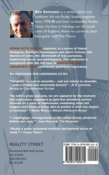 DOWN WITH BEAUTY explores, in a series of linked dialogues, dramatic monologues and short fictions, the themes of exile, the aftermath of war, paranoia, improvised music and nothingness. The collection is completed with the full text of NOSTALGIA FOR UNKNOWN CITIES, previously published separately. KEN EDWARDS is a writer, editor and publisher. He ran Reality Studios magazine from 1978-88 and later co-founded Reality Street. He lives in Hastings, on the south coast of England, where he currently plays bass guitar with The Moors.