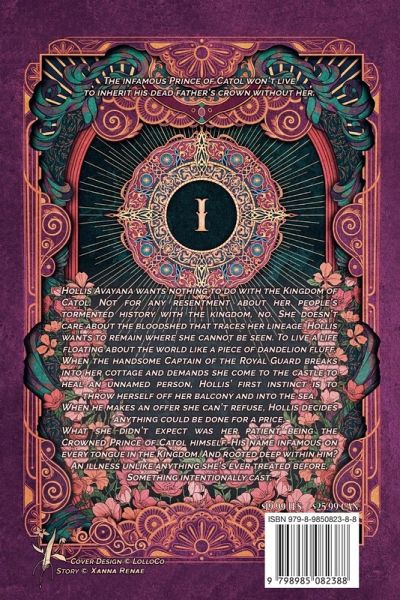The infamous Prince of Catol won't live to inherit his dead father's crown without her. Hollis Avayana wants nothing to do with the Kingdom of Catol. Not for any resentment about her people's tormented history with the kingdom, no. She doesn't care about the bloodshed that traces her lineage. Hollis wants to remain where she cannot be seen. To live a life floating about the world like a piece of dandelion fluff. When the handsome Captain of the Royal Guard breaks into her cottage and demands she come to the castle to heal an unnamed person, Hollis' first instinct is to throw herself off her balcony and into the sea. When he makes an offer she can't refuse, Hollis decides anything could be done for a price. What she didn't expect was her patient being the Crowned Prince of Catol himself. His name infamous on every tongue in the Kingdom. And rooted deep within him? An illness unlike anything she's ever treated before. Something intentionally cast.