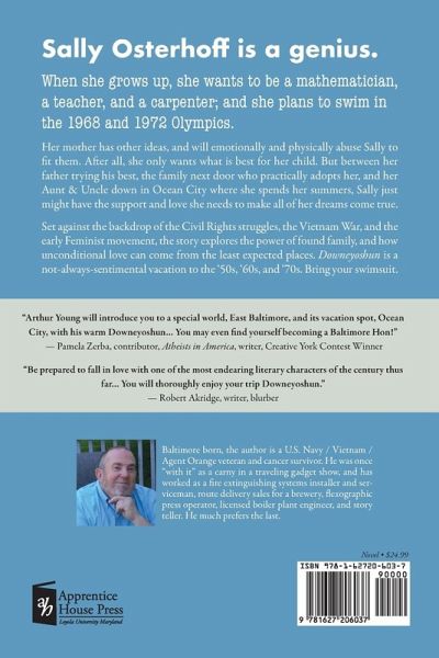 Sally Osterhoff is a genius. When she grows up, she wants to be a mathematician, a teacher, and a carpenter; and she plans to swim in the 1968 and 1972 Olympics. Her mother has other ideas, and will emotionally and physically abuse Sally to fit them. After all, she only wants what is best for her child. But between her father trying his best, the family next door who practically adopts her, and her Aunt & Uncle down in Ocean City where she spends her summers, Sally just might have the support and love she needs to make all of her dreams come true. Set against the backdrop of the Civil Rights struggles, the Vietnam War, and the early Feminist movement, the story explores the power of found family, and how unconditional love can come from the least expected places. Downeyoshun is a not-always-sentimental vacation to the '50s, '60s, and '70s. Bring your swimsuit.