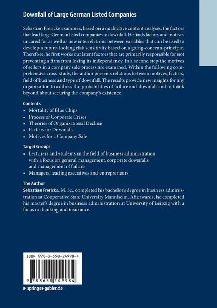 Sebastian Frericks examines, based on a qualitative content analysis, the factors that lead large German listed companies to downfall. He finds factors and motives uncaredfor as well as new interrelations between variables that can be used to develop a future-looking risk sensitivity based on a going-concern-principle. Therefore, he first works out latent factors that are primarily responsible for not preventing a firm from losing its independency. In a second step the motives of sellers in a company sale process are examined. Within the following comprehensive cross-study, the author presents relations between motives, factors, field of business and type of downfall. The results provide new insights for any organization to address the probabilities of failure and downfall and to think beyond about securing the company's existence.