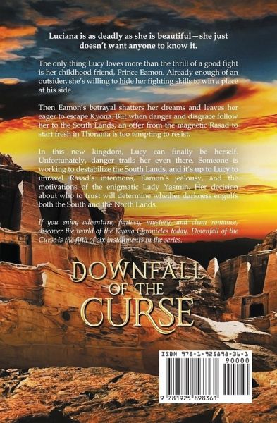 Luciana is as deadly as she is beautiful-she just doesn't want anyone to know it The only thing Lucy loves more than the thrill of a good fight is her childhood friend, Prince Eamon. Already enough of an outsider, she's willing to hide her fighting skills to win a place at his side. Then Eamon's betrayal shatters her dreams and leaves her eager to escape Kyona. But when danger and disgrace follow her to the South Lands, an offer from the magnetic Rasad to start fresh in Thorania is too tempting to resist. In this new kingdom, Lucy can finally be herself. Unfortunately, danger trails her even there. Someone is working to destabilize the South Lands, and it's up to Lucy to unravel Rasad's intentions, Eamon's jealousy, and the motivations of the enigmatic Lady Yasmin. Her decision about who to trust will determine whether darkness engulfs both the South and the North Lands. If you enjoy adventure, fantasy, mystery, and clean romance, discover the world of the Kyona Chronicles today. Downfall of the Curse is the fifth of six installments in the series.
