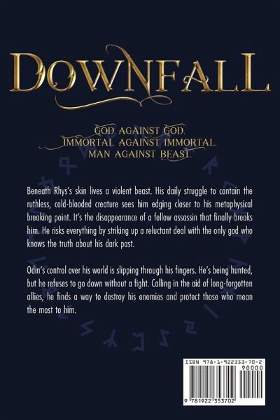God against god. Immortal against immortal.Man against beast. Beneath Rhys's skin lives a violent beast. His daily struggle to contain the ruthless, cold-blooded creature sees him edging closer to his metaphysical breaking point. It's the disappearance of a fellow assassin that finally breaks him. He risks everything by striking up a reluctant deal with the only god who knows the truth about his dark past. Odin's control over his world is slipping through his fingers. He's being hunted, but he refuses to go down without a fight. Calling in the aid of long-forgotten allies, he finds a way to destroy his enemies and protect those who mean the most to him. Downfall is a dark gritty urban fantasy. This is a violent tale of revenge and regrets. Suitable for 18+ readers, it's the final book in the Gods & Monsters trilogy. Perfect for fans of J.R. Ward, Gena Showalter, Kelly St. Clare, and Laurell K. Hamilton!