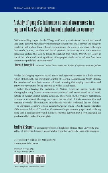 A study of gospel's influence on social awareness in a region of the South that lacked a plantation economy Jerrilyn McGregory explores sacred music and spiritual activism in a little-known region of the South--the Wiregrass Country of Georgia, Alabama, and north Florida. She examines African American sacred music outside of Sunday church-related activities, showing that singing conventions and anniversary programs fortify spiritual as well as social needs. In this region African Americans maintain a social world of their own creation. Their cultural performances embrace some of the most pervasive forms of African American sacred music--spirituals, common meter, Sacred Harp, shape-note, traditional, and contemporary gospel. Moreover, the contexts in which they sing include present-day observations such as the Twentieth of May (Emancipation Day), Burial League Turnouts, and Fifth Sunday. Rather than tracing the evolution of African American sacred music, this ethnographic study focuses on contemporary cultural performances, almost all by women, which embrace all forms. These women promote a womanist theology to ensure the survival of their communities and personal networks. They function in leadership roles that withstand the test of time. Their spiritual activism presents itself as a way of life. In Wiregrass Country, "You don't have to sing like an angel" is a frequently expressed sentiment. To local adherents, "good" music is God's music regardless of the manner delivered. Therefore, Downhome Gospel presents gospel music as being more than a transcendent sound. It is local spiritual activism that is writ large and the good news that makes the soul glad. Jerrilyn McGregory, Tallahassee, Florida, is associate professor of English at Florida State University.