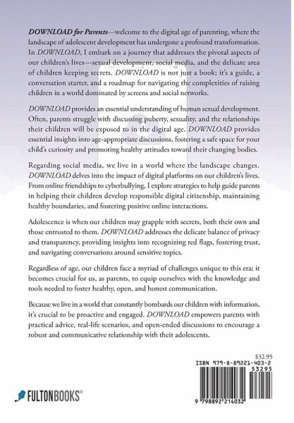 DOWNLOAD for Parents-welcome to the digital age of parenting, where the landscape of adolescent development has undergone a profound transformation. In DOWNLOAD, I embark on a journey that addresses the pivotal aspects of our children's lives-sexual development, social media, and the delicate area of children keeping secrets. DOWNLOAD is not just a book; it's a guide, a conversation starter, and a roadmap for navigating the complexities of raising children in a world dominated by screens and social networks. DOWNLOAD provides an essential understanding of human sexual development. Often, parents struggle with discussing puberty, sexuality, and the relationships their children will be exposed to in the digital age. DOWNLOAD provides essential insights into age-appropriate discussions, fostering a safe space for your child's curiosity and promoting healthy attitudes toward their changing bodies. Regarding social media, we live in a world where the landscape changes. DOWNLOAD delves into the impact of digital platforms on our children's lives. From online friendships to cyberbullying, I explore strategies to help guide parents in helping their children develop responsible digital citizenship, maintaining healthy boundaries, and fostering positive online interactions. Adolescence is when our children may grapple with secrets, both their own and those entrusted to them. DOWNLOAD addresses the delicate balance of privacy and transparency, providing insights into recognizing red flags, fostering trust, and navigating conversations around sensitive topics. Regardless of age, our children face a myriad of challenges unique to this era; it becomes crucial for us, as parents, to equip ourselves with the knowledge and tools needed to foster healthy, open, and honest communication. Because we live in a world that constantly bombards our children with information it's crucial to be proactive and engaged. DOWNLOAD empowers parents with practical advice, real-life scenarios, and open-ended discussions to encourage a robust and communicative relationship with their adolescents.