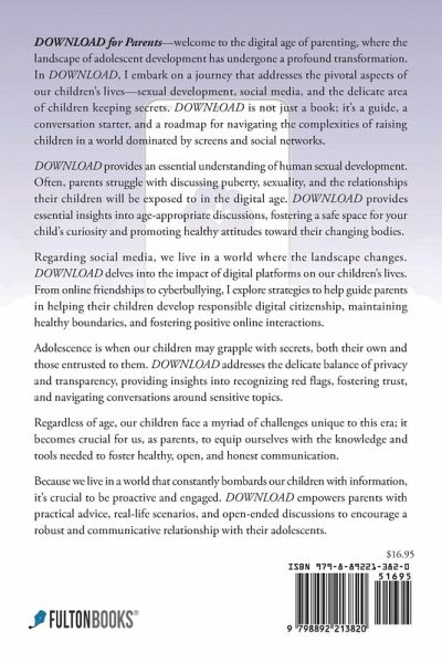 DOWNLOAD for Parents-welcome to the digital age of parenting, where the landscape of adolescent development has undergone a profound transformation. In DOWNLOAD, I embark on a journey that addresses the pivotal aspects of our children's lives-sexual development, social media, and the delicate area of children keeping secrets. DOWNLOAD is not just a book; it's a guide, a conversation starter, and a roadmap for navigating the complexities of raising children in a world dominated by screens and social networks. DOWNLOAD provides an essential understanding of human sexual development. Often, parents struggle with discussing puberty, sexuality, and the relationships their children will be exposed to in the digital age. DOWNLOAD provides essential insights into age-appropriate discussions, fostering a safe space for your child's curiosity and promoting healthy attitudes toward their changing bodies. Regarding social media, we live in a world where the landscape changes. DOWNLOAD delves into the impact of digital platforms on our children's lives. From online friendships to cyberbullying, I explore strategies to help guide parents in helping their children develop responsible digital citizenship, maintaining healthy boundaries, and fostering positive online interactions. Adolescence is when our children may grapple with secrets, both their own and those entrusted to them. DOWNLOAD addresses the delicate balance of privacy and transparency, providing insights into recognizing red flags, fostering trust, and navigating conversations around sensitive topics. Regardless of age, our children face a myriad of challenges unique to this era; it becomes crucial for us, as parents, to equip ourselves with the knowledge and tools needed to foster healthy, open, and honest communication. Because we live in a world that constantly bombards our children with information it's crucial to be proactive and engaged. DOWNLOAD empowers parents with practical advice, real-life scenarios, and open-ended discussions to encourage a robust and communicative relationship with their adolescents.