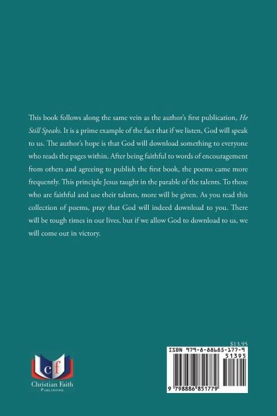 This book follows along the same vein as the author's first publication, He Still Speaks. It is a prime example of the fact that if we listen, God will speak to us. The author's hope is that God will download something to everyone who reads the pages within. After being faithful to words of encouragement from others and agreeing to publish the first book, the poems came more frequently. This principle Jesus taught in the parable of the talents. To those who are faithful and use their talents, more will be given. As you read this collection of poems, pray that God will indeed download to you. There will be tough times in our lives, but if we allow God to download to us, we will come out in victory.