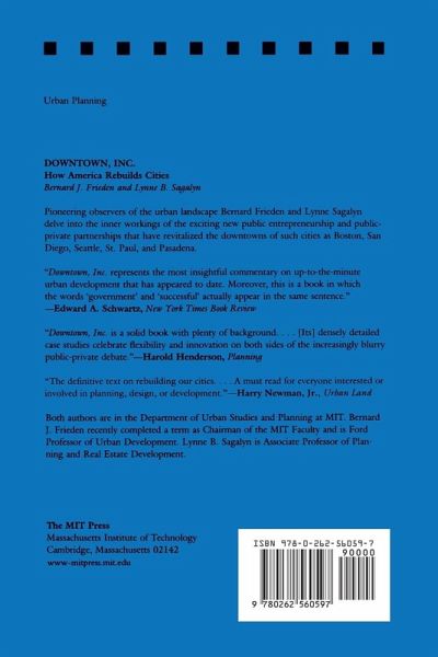 Pioneering observers of the urban landscape Bernard Frieden and Lynn Sagalyn delve into the inner workings of the new public entrepreneurship and public private partnerships that have revitalized the downtowns of such cities as Boston, San Diego, Seattle, St. Paul, and Pasadena.