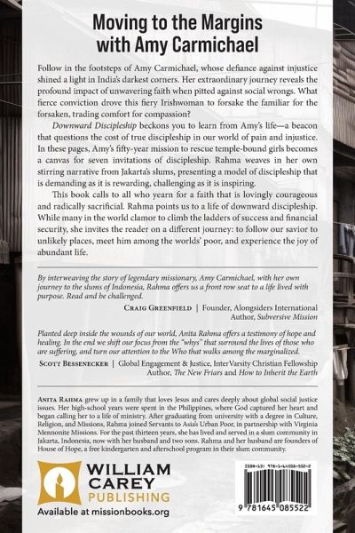 Moving to the Margins with Amy Carmichael Follow in the footsteps of Amy Carmichael, whose defiance against injustice shined a light in India’s darkest corners. Her extraordinary journey reveals the profound impact of unwavering faith when pitted against social wrongs. What fierce conviction drove this fiery Irishwoman to forsake the familiar for the forsaken, trading comfort for conflict and compassion? Downward Discipleship beckons you to learn from Amy's life—a beacon that questions the cost of true discipleship in our world of pain and injustice. In these pages, Amy's fifty-year mission to rescue temple-bound girls becomes a canvas for seven invitations of discipleship. Rahma weaves in her own stirring narrative from Jakarta's slums, presenting a model of discipleship that is demanding as it is rewarding, challenging as it is inspiring. This book calls to all who yearn for a faith that is lovingly courageous and radically sacrificial. Rahma points us to a life of downward discipleship. While many in the world clamor to climb the ladders of success and financial security, she invites the reader on a different journey: to follow our savior to unlikely places, meet him among the world’s poor, and experience the joy of abundant life.