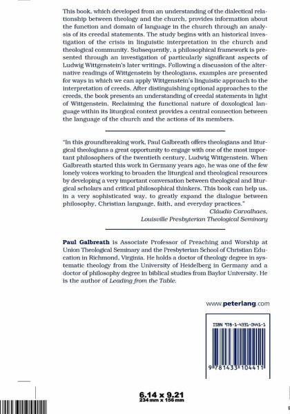 «In this groundbreaking work, Paul Galbreath offers theologians and liturgical theologians a great opportunity to engage with one of the most important philosophers of the twentieth century, Ludwig Wittgenstein. When Galbreath started this work in Germany years ago, he was one of the few lonely voices working to broaden the liturgical and theological resources by developing a very important conversation between theological and liturgical scholars and critical philosophical thinkers. This book can help us, in a very sophisticated way, to greatly expand the dialogue between philosophy, Christian language, faith, and everyday practices.» (Cláudio Carvalhaes, Louisville Presbyterian Theological Seminary)