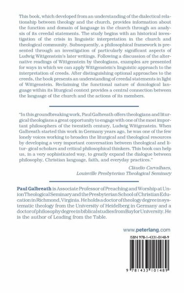 «In this groundbreaking work, Paul Galbreath offers theologians and liturgical theologians a great opportunity to engage with one of the most important philosophers of the twentieth century, Ludwig Wittgenstein. When Galbreath started this work in Germany years ago, he was one of the few lonely voices working to broaden the liturgical and theological resources by developing a very important conversation between theological and liturgical scholars and critical philosophical thinkers. This book can help us, in a very sophisticated way, to greatly expand the dialogue between philosophy, Christian language, faith, and everyday practices.» (Cláudio Carvalhaes, Louisville Presbyterian Theological Seminary)