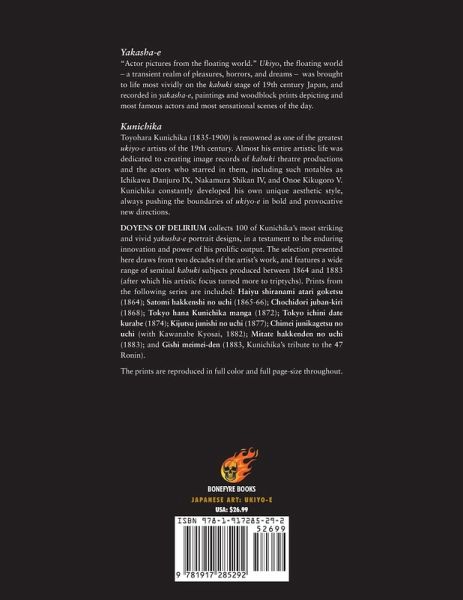 Toyohara Kunichika (1835-1900) is renowned as one of the greatest ukiyo-e artists of the 19th century. Almost his entire artistic life was dedicated to creating image records of kabuki theatre productions and the actors who starred in them, including such notables as Ichikawa Danjuro IX, Nakamura Shikan IV, and Onoe Kikugoro V. Kunichika constantly developed his own unique aesthetic style, always pushing the boundaries of ukiyo-e in bold and provocative new directions. DOYENS¿OF¿DELIRIUM collects 100 of Kunichika's most striking and vivid kabuki actor portrait designs, in a testament to the enduring innovation and power¿of his prolific output. The selection presented here draws from two decades of the artist's work, and features a wide range of seminal kabuki subjects produced between 1864 and 1883 (after which his artistic focus turned more to the triptych format). Prints from the following series are included: Haiyu shiranami atari goketsu (1864); Satomi hakkenshi no uchi (1865-66); Chochidori juban-kiri (1868); Tokyo hana Kunichika manga (1872); Tokyo ichini date kurabe (1874); Kijutsu junishi no uchi (1877); Chimei junikagetsu no uchi (with Kawanabe Kyosai, 1882); Mitate hakkenden no uchi (1883); and Gishi meimei-den (1883, Kunichika's tribute to the 47 Ronin). The prints are reproduced in full color and full page-size throughout.