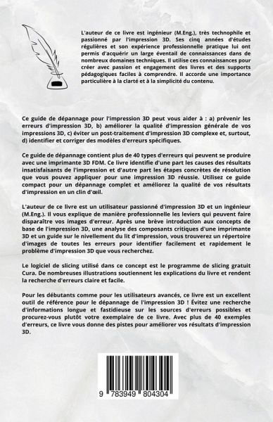 En bonus, vous trouverez un profil d'impression 3D optimisé pour Cura en annexe du livre. Épargnez-vous un post-traitement d'impression 3D complexe ! Ce guide de dépannage pour l'impression 3D peut vous aider à : a) prévenir les erreurs d'impression 3D, b) améliorer la qualité d'impression générale de vos impressions 3D, c) éviter un post-traitement d'impression 3D complexe et, surtout, d) identifier et corriger des modèles d'erreurs spécifiques. Ce guide de dépannage contient plus de 40 types d'erreurs qui peuvent se produire avec une imprimante 3D FDM. Ce livre identifie d'une part les causes des résultats insatisfaisants de l'impression et d'autre part les étapes concrètes de résolution que vous pouvez appliquer pour une impression 3D réussie. Utilisez ce guide compact pour un dépannage complet et améliorez la qualité de vos résultats d'impression en un clin d'¿il. L'auteur de ce livre est un utilisateur passionné d'impression 3D et un ingénieur (M.Eng.). Il vous explique de manière professionnelle les leviers qui peuvent faire disparaître vos images d'erreur. Après une brève introduction aux concepts de base de l'impression 3D, une analyse des composants critiques d'une imprimante 3D et un guide sur le nivellement du lit d'impression, vous trouverez un répertoire d'images de toutes les erreurs pour identifier facilement et rapidement le problème d'impression 3D que vous recherchez. Jetez un coup d'¿il au livre et obtenez votre exemplaire ! Le logiciel de slicing utilisé dans ce concept est le programme de slicing gratuit Cura. De nombreuses illustrations soutiennent les explications du livre et rendent la recherche d'erreurs claire et facile. Pour les débutants comme pour les utilisateurs avancés, ce livre est un excellent outil de référence pour le dépannage de l'impression 3D ! Évitez une recherche d'informations longue et fastidieuse sur les sources d'erreurs possibles et procurez-vous plutôt votre exemplaire de ce livre. Avec plus de 40 exemples d'erreurs, ce livre vous donne des pistes pour améliorer vos résultats d'impression 3D. Un bref aperçu des erreurs couvertes : a) La "Hot End" ne chauffe pas b) La buse est obstruée c) L'impression ne démarre pas d) Manque d'adhérence e) Problèmes de filaments f) "Under Extrusion" et "Over Extrusion" g) "Curling" h) "Stringing" ou "Oozing" i) "Blobs" et "Zits" j) "Pillowing" k) "Vibration" et "Ringing" ("Ghosting") l) "Warping" m) Pied d'éléphant n) "z-axis wobble" z o) Couche- Lacunes ("Layer Cracking / Separation / Splitting") p) Déplacement des couches q) Couches manquantes r) Éraflures sur l'impression s) L'imprimante 3D renverse des pièces t) Mauvais pontage u) L'impression 3D ne peut pas être retirée du lit d'impression v) Le coutour z est très visible w) Déviations dimensionnelles entre l'impression et le modèle CAO x) Problèmes de remplissage y) Problèmes généraux de la structure de support z) Chute de la structure de support. Jetez un coup d'¿il au livre et obtenez votre exemplaire !