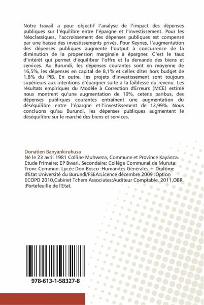 Notre travail a pour objectif l'analyse de l'impact des dépenses publiques sur l'équilibre entre l'épargne et l'investissement. Pour les Néoclassiques, l'accroissement des dépenses publiques est compensé par une baisse des investissements privés. Pour Keynes, l'augmentation des dépenses publiques augmente l'output à concurrence de la diminution de la propension marginale à épargner. C'est le taux d'intérêt qui permet d'équilibrer l'offre et la demande des biens et services. Au Burundi, les dépenses courantes sont en moyenne de 16,5%, les dépenses en capital de 8,1% et celles dites hors budget de 1,8% du PIB. En outre, les projets d'investissement sont toujours supérieurs aux intentions d'épargner suite à la faiblesse du revenu. Les résultats empiriques du Modèle à Correction d'Erreurs (MCE) estimé nous montrent qu'une augmentation de 10%, ceteris paribus, des dépenses publiques courantes entraînent une augmentation du déséquilibre entre l'épargne et l'investissement de 12,99%. Nous concluons qu'au Burundi, les dépenses publiques augmentent le déséquilibre sur le marché des biens et services.