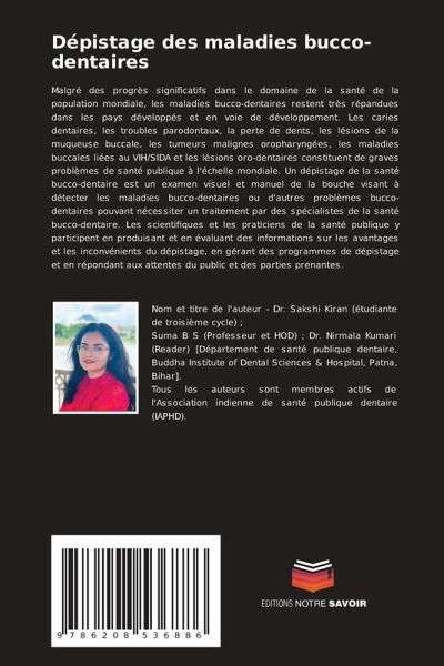 Malgré des progrès significatifs dans le domaine de la santé de la population mondiale, les maladies bucco-dentaires restent très répandues dans les pays développés et en voie de développement. Les caries dentaires, les troubles parodontaux, la perte de dents, les lésions de la muqueuse buccale, les tumeurs malignes oropharyngées, les maladies buccales liées au VIH/SIDA et les lésions oro-dentaires constituent de graves problèmes de santé publique à l'échelle mondiale. Un dépistage de la santé bucco-dentaire est un examen visuel et manuel de la bouche visant à détecter les maladies bucco-dentaires ou d'autres problèmes bucco-dentaires pouvant nécessiter un traitement par des spécialistes de la santé bucco-dentaire. Les scientifiques et les praticiens de la santé publique y participent en produisant et en évaluant des informations sur les avantages et les inconvénients du dépistage, en gérant des programmes de dépistage et en répondant aux attentes du public et des parties prenantes.
