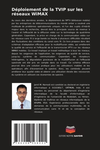 Au cours des dernières années, le déploiement de l'IPTV (télévision mobile) par les entreprises de télécommunications du monde entier a soulevé une multitude de problèmes opérationnels uniques, et l'un des sujets d'intérêt majeur dans la recherche, devrait être la principale source de revenus à l'avenir et l'efficacité de la diffusion vidéo sur la technologie de quatrième génération. Cependant, la prise en charge de la communication vidéo sur les réseaux sans fil à large bande se heurte à plusieurs difficultés résultant des fluctuations des conditions du canal sans fil. Ce livre propose donc des schémas d'adaptation efficaces pour la multidiffusion vidéo, qui améliorent la qualité de service et l'efficacité de la transmission IPTV sur les réseaux WiMAX mobiles. Ce travail implique un travail méthodique à tous les niveaux, depuis les exigences de l'application, les exigences de qualité de service, jusqu'au système de communication. Cependant, les récepteurs hétérogènes, la dégradation gracieuse de la multidiffusion et l'efficacité spectrale ont été pris en compte dans ce travail. Ce schéma efficace pourrait être une solution pratique pour les utilisateurs mobiles et les opérateurs afin d'économiser le spectre. Ainsi, les combinés peuvent améliorer leur qualité vidéo et obtenir une utilisation élevée des ressources du système en utilisant ces économies de spectre.