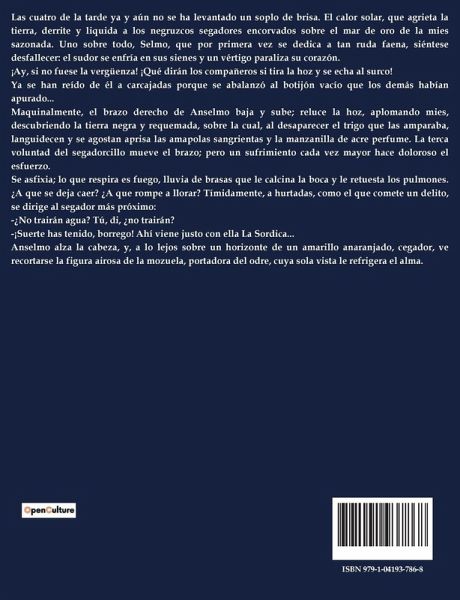 Las cuatro de la tarde ya y aún no se ha levantado un soplo de brisa. El calor solar, que agrieta la tierra, derrite y liquida a los negruzcos segadores encorvados sobre el mar de oro de la mies sazonada. Uno sobre todo, Selmo, que por primera vez se dedica a tan ruda faena, siéntese desfallecer: el sudor se enfría en sus sienes y un vértigo paraliza su corazón. ¡Ay, si no fuese la vergüenza! ¡Qué dirán los compañeros si tira la hoz y se echa al surco! Ya se han reído de él a carcajadas porque se abalanzó al botijón vacío que los demás habían apurado... Maquinalmente, el brazo derecho de Anselmo baja y sube; reluce la hoz, aplomando mies, descubriendo la tierra negra y requemada, sobre la cual, al desaparecer el trigo que las amparaba, languidecen y se agostan aprisa las amapolas sangrientas y la manzanilla de acre perfume. La terca voluntad del segadorcillo mueve el brazo; pero un sufrimiento cada vez mayor hace doloroso el esfuerzo. Se asfixia; lo que respira es fuego, lluvia de brasas que le calcina la boca y le retuesta los pulmones. ¿A que se deja caer? ¿A que rompe a llorar? Tímidamente, a hurtadas, como el que comete un delito, se dirige al segador más próximo: -¿No trairán agua? Tú, di, ¿no trairán? -¡Suerte has tenido, borrego! Ahí viene justo con ella La Sordica... Anselmo alza la cabeza, y, a lo lejos sobre un horizonte de un amarillo anaranjado, cegador, ve recortarse la figura airosa de la mozuela, portadora del odre, cuya sola vista le refrigera el alma.