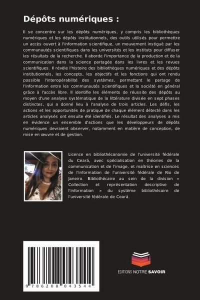 Il se concentre sur les dépôts numériques, y compris les bibliothèques numériques et les dépôts institutionnels, des outils utilisés pour permettre un accès ouvert à l'information scientifique, un mouvement instigué par les communautés scientifiques dans les universités et les instituts pour diffuser les résultats de la recherche. Il aborde l'importance de la production et de la communication dans la science partagée dans les livres et les revues scientifiques. Il révèle l'histoire des bibliothèques numériques et des dépôts institutionnels, les concepts, les objectifs et les fonctions qui ont rendu possible l'interopérabilité des systèmes, permettant le partage de l'information entre les communautés scientifiques et la société en général grâce à l'accès libre. Il identifie les éléments de réussite des dépôts au moyen d'une analyse systématique de la littérature divisée en sept phases distinctes, qui a donné lieu à l'analyse de trois articles. Les défis, les actions et les opportunités de pratique de chaque élément détecté dans les articles analysés ont ensuite été identifiés. Le résultat des analyses a mis en évidence un ensemble d'actions que les développeurs de dépôts numériques devraient observer, notamment en matière de conception, de mise en oeuvre et de gestion.