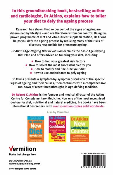 In this new book bestselling author and cardiologist Dr Atkins explains how to tailor your diet to defy the ageing process. Research has shown that 70 percent of the signs of ageing are determined by lifestyle and are therefore within our control. Using his proven programme of diet and vita-nutrient supplementation Dr Atkinshelps you defy the ageing process by reducing many of the risks ofdiseases responsible for premature ageing. The book presents a symptom-by-symptom discussion of the specific signs of ageing and their causes then continues with a comprehensive run-down of recent breakthroughs in age-defying medicine. Dr Atkins Age-Defying Diet Revolution including advice on:--How to find your greatest risk factors--What symptoms and tests will tell you--How to select the most successful diet for you--How to modify and fine tune your diet--How to use antioxidants to defy ageing