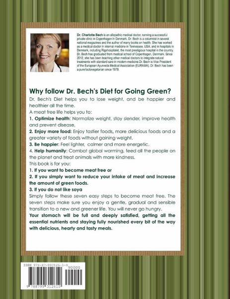 Dr. Bechs' Diet helps you to: 1. Optimize health: Normalize weight, stay slender, improve health and prevent disease. 2. Enjoy more food: Enjoy tastier foods, more delicious foods, and a greater variety of foods without gaining weight. 3. Be happier: Feel lighter, be calmer and have more energy. This book is for you: 1. If you want to become meat free or 2. If you simply want to reduce your intake of meat and increase the green foods. 3. If you don't like soya. The seven steps will make sure you enjoy a gentle, gradual and medically sound transition to a new and greener life. You will never go hungry - instead, your stomach will be full and deeply satisfied, getting all the essential nutrients and staying fully nourished every bit of the way with delicious, hearty and tasty meals.