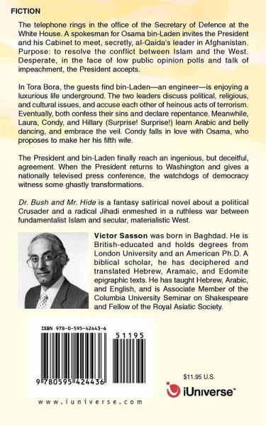 The telephone rings in the office of the Secretary of Defence at the White House. A spokesman for Osama bin-Laden invites the President and his Cabinet to meet, secretly, al-Qaida's leader in Afghanistan. Purpose: to resolve the conflict between Islam and the West. Desperate, in the face of low public opinion polls and talk of impeachment, the President accepts. In Tora Bora, the guests find bin-Laden-an engineer - is enjoying a luxurious life underground. The two leaders discuss political, religious, and cultural issues, and accuse each other of heinous acts of terrorism. Eventually, both confess their sins and declare repentance. Meanwhile, Laura, Condy, and Hillary (Surprise! Surprise!) learn Arabic and belly dancing, and embrace the veil. Condy falls in love with Osama, who proposes to make her his fifth wife. The President and bin-Laden finally reach an ingenious, but deceitful, agreement. When the President returns to Washington and gives a nationally televised press conference, the watchdogs of democracy witness some ghastly transformations. Dr. Bush and Mr. Hide is a fantasy satirical novel about a political Crusader and a radical Jihadi enmeshed in a ruthless war between fundamentalist Islam and secular, materialistic West.