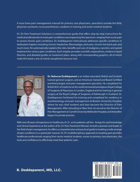 A must have pain management manual for primary care physicians, specialists outside the field, physician assistants, nurse practitioners, residents in training and senior medical students. Dr. D's Pain Treatment Solutions is comprehensive guide that offers step-by-step instructions for medical professionals to treat pain conditions encompassing the spectrum, ranging from acute pain to severe chronic pain conditions. Dr. Doddapaneni meticulously addresses specific conditions in dedicated chapters including chronic headaches, fibromyalgia, joint pain, chronic low back pain and much more. He systematically explains the roles, benefits and uses of analgesics, narcotics and opioid treatment for various pain conditions. Each chapter provides scientific explanations, evidence based theories, and detailed guides on treatment plans, along with corresponding graphics, all of which make this book a one of a kind, exceptional resource tool.