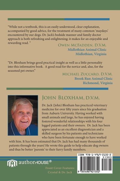 ?While not a textbook, this is an easily understood, clear explanation, accompanied by good advice, for the treatment of many common ?maydays? encountered by our dogs. Dr. Jack?s bedside manner and family doctor approach is both refreshing and enlightening; it makes for an enjoyable and rewarding read. ? Owen McFadden, DVM Midlothian Animal Clinic Midlothian, Virginia ?Dr. Bloxham brings good practical insight as well as a little personality into this informative book. A good read for the novice and, also, for the seasoned pet owner. Michael Zuccaro, DVM Brook Run Animal Clinic Richmond, VA