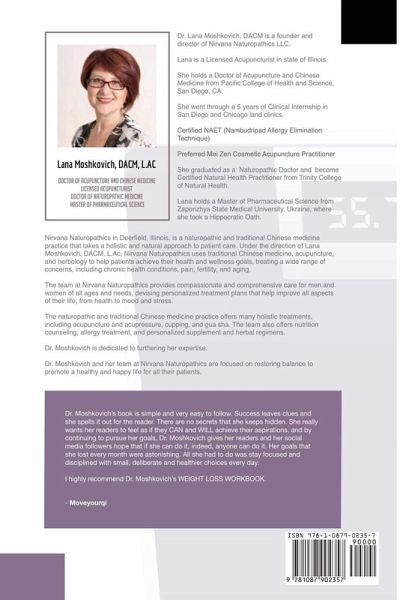 PRODUCT DESCRIPTION My name is Lana Moshkovich and I am a Doctor of Acupuncture and Chinese Medicine. I practice in the state of IL in a beautiful Clinic in Deerfield. All my life I struggled with weight loss and finally created a wonderful support system for myself. I lost 43 pounds in 10 month. I would like to share it with you. This book is not the same as as other's books. Instead of writing a general weight loss book I thought to share with you my personal daily, weekly, monthly routines. Lana's Weight Loss Workbook is a series of 3 month volumes. It's organized and developed in a daily format with motivational help, my daily food intake and recipes, pictures and gym routines. Anyone can replicate the work I have done and it's doable. Every day you will see my story and my routines for the day and you have an opportunity to write down what you are going to do and what you have done. You can enter your metrics every day ( weight, BMI, size...) Morning Brainstorm. On your workbook page you have Morning Brainstorm where you get ready for this particular day. This is your planning thoughts. Evening Reflection. Here you have an opportunity to write what you have done for your weight loss, meals that you eat, workout you have done. FROM THE BACK COVER Dr. Lana Moshkovich, DACM is a founder and director of Nirvana Naturopathics. Lana is a Doctor of Acupuncture and Chinese Medicine and a Licensed Acupuncturist in state of Illinois. Lana holds a Master of Pharmaceutical Science from ZSMU, Ukraine, where she took a Hippocratic Oath. Lana Moshkovich helps patients achieve their health and wellness goals, treating a wide range of concerns, including chronic health conditions, pain, fertility, allergies, and aging. For more information visit www.nirvananaturopathics.com REVIEWS "Can a person lose weight surely, steadily, and without feeling deprived? Dr. Moshkovich presents herself as Exhibit A in "Lana's Weight Loss Guide and Workbook," and answers that question with a resounding yes. Her book recounts her personal journey, and if the reader follows her daily, weekly, and monthly steps, it is absolutely possible to follow in her path to success in just three months. Her approach is holistic, since in the rest of her life, she is a Traditional Chinese Medicine doctor highly experienced with herbal remedies, nutrition, and acupuncture. Using Lana's frank confessions, motivational essays, journaling prompts, recipes, and even exercise tips that can actually be accomplished, readers have a three month program for weight loss that is destined to be successful. Reading this book is like having the personal weight loss partner you've always wanted." -Nadiya Melnyk, DAOM, L.Ac, AMFT