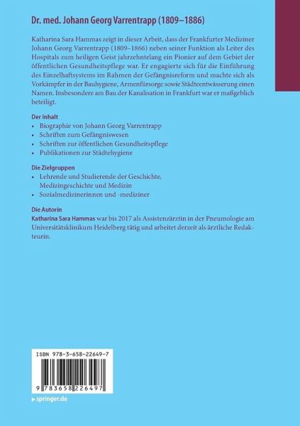 Katharina Sara Hammas zeigt in dieser Arbeit, dass der Frankfurter Mediziner Johann Georg Varrentrapp (1809-1866) neben seiner Funktion als Leiter des Hospitals zum heiligen Geist jahrzehntelang ein Pionier auf dem Gebiet der öffentlichen Gesundheitspflege war. Er engagierte sich für die Einführung des Einzelhaftsystems im Rahmen der Gefängnisreform und machte sich als Vorkämpfer in der Bauhygiene, Armenfürsorge sowie Städteentwässerung einen Namen. Insbesondere am Bau der Kanalisation in Frankfurt war er maßgeblich beteiligt.