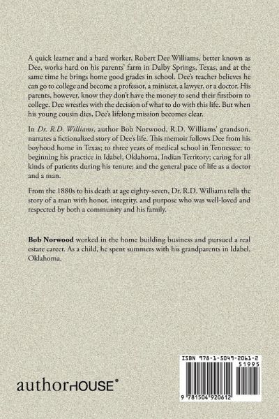 A quick learner and a hard worker, Robert Dee Williams, better known as Dee, works hard on his parents' farm in Dalby Springs, Texas, and at the same time he brings home good grades in school. Dee's teacher believes he can go to college and become a professor, a minister, a lawyer, or a doctor. His parents, however, know they don't have the money to send their firstborn to college. Dee wrestles with the decision of what to do with this life. But when his young cousin dies, Dee's lifelong mission becomes clear. In Dr. R.D. Williams, author Bob Norwood, R.D. Williams' grandson, narrates a fictionalized story of Dee's life. This memoir follows Dee from his boyhood home in Texas; to three years of medical school in Tennessee; to beginning his practice in Idabel, Oklahoma, Indian Territory; caring for all kinds of patients during his tenure; and the general pace of life as a doctor and a man. From the 1880s to his death at age eighty-seven, Dr. R.D. Williams tells the story of a man with honor, integrity, and purpose who was well-loved and respected by both a community and his family.