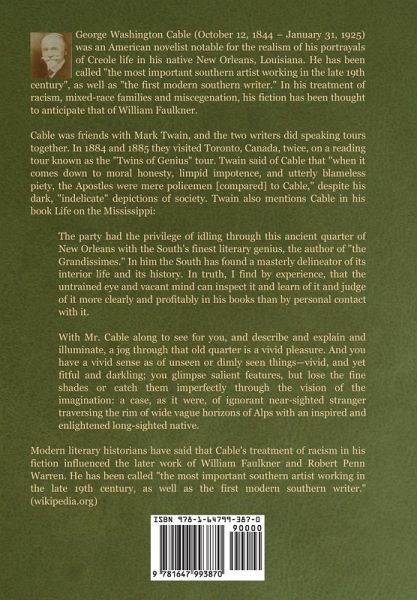 George Washington Cable (October 12, 1844 - January 31, 1925) was an American novelist notable for the realism of his portrayals of Creole life in his native New Orleans, Louisiana. He has been called "the most important southern artist working in the late 19th century", as well as "the first modern southern writer." In his treatment of racism, mixed-race families and miscegenation, his fiction has been thought to anticipate that of William Faulkner. He also wrote articles critical of contemporary society. Due to hostility against him after two 1885 essays encouraging racial equality and opposing Jim Crow, Cable moved with his family to Northampton, Massachusetts. He lived there for the next thirty years, then moved to Florida. Cable was friends with Mark Twain, and the two writers did speaking tours together. In 1884 and 1885 they visited Toronto, Canada, twice, on a reading tour known as the "Twins of Genius" tour. Twain said of Cable that "when it comes down to moral honesty, limpid impotence, and utterly blameless piety, the Apostles were mere policemen [compared] to Cable," despite his dark, "indelicate" depictions of society. Twain also mentions Cable in his book Life on the Mississippi: The party had the privilege of idling through this ancient quarter of New Orleans with the South's finest literary genius, the author of "the Grandissimes." In him the South has found a masterly delineator of its interior life and its history. In truth, I find by experience, that the untrained eye and vacant mind can inspect it and learn of it and judge of it more clearly and profitably in his books than by personal contact with it. With Mr. Cable along to see for you, and describe and explain and illuminate, a jog through that old quarter is a vivid pleasure. And you have a vivid sense as of unseen or dimly seen things--vivid, and yet fitful and darkling; you glimpse salient features, but lose the fine shades or catch them imperfectly through the vision of the imagination: a case, as it were, of ignorant near-sighted stranger traversing the rim of wide vague horizons of Alps with an inspired and enlightened long-sighted native. Modern literary historians have said that Cable's treatment of racism in his fiction influenced the later work of William Faulkner and Robert Penn Warren. He has been called "the most important southern artist working in the late 19th century, as well as the first modern southern writer." In 2008 a new edition of his history of the South, including footnotes and research, was published by Louisiana State University Press under the title, The New Orleans of George Washington Cable: The 1887 Census Office Report, edited and with an introduction by Lawrence N. Powell. Cable may have coined the term "authors' editor", in his 1910 tribute to his editor Richard Watson Gilder, when he wrote "I think he was peculiarly an authors' editor, and not merely a publishers'."; this is the earliest known use of the term in print. (wikipedia.org)