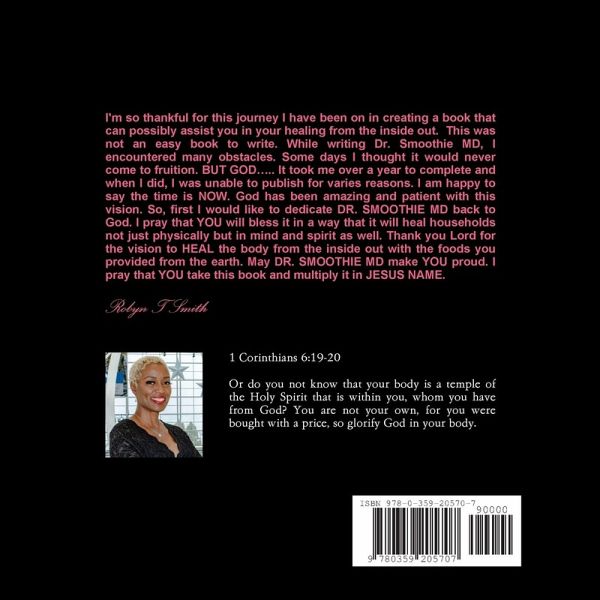 EVERYONE LOVES SMOOTHIES and DR. SMOOTHIE, MD was created with your health and wellness in mind. Every ingredient focuses on your particular health concern. Inside you will find smoothies for weight loss, fitness, hypertension, inflammation, cancer, fertility and more. This is also a fun way to consume your fruits and vegetable servings for the day. All ingredients are from the earth. NO SUGAR ADDED. Dr. Smoothie MD is a suggestive option and not claiming to be a cure or to cure any disease or ailment. In the back of Dr. Smoothie, MD you will find INSTRUCTIONS ON HOW TO BUILD YOUR OWN SMOOTHIES.