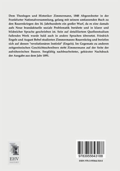 Dem Theologen und Historiker Zimmermann, 1848 Abgeordneter in der Frankfurter Nationalversammlung, gelang mit seinem umfassenden Buch zu den Bauernkriegen des 16. Jahrhunderts ein großer Wurf, da es eine damals aufs Neue brandaktuelle soziale Problematik berührte und in klarer und bildreicher Sprache geschrieben ist. Sein auf detailliertem Quellenstudium fußendes Werk wurde bald auch in andere Sprachen übersetzt. Friedrich Engels und August Bebel studierten Zimmermanns Bauernkrieg und beriefen sich auf dessen "revolutionären Instinkt" (Engels). Im Gegensatz zu anderen zeitgenössischen Geschichtsschreibern steht Zimmermann auf der Seite der aufrührerischen Bauern. Sorgfältig nachbearbeiteter, gekürzter Nachdruck der Ausgabe aus dem Jahr 1891.