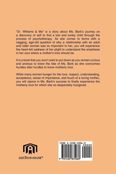 "Dr. Williams and Me" is a story about Ms. Barb's journey on a discovery of self to find a lost and lonely child through the process of psychotherapy. As she comes to terms with a nagging, age-old question of why a relationship with an adult and older woman was so important to her, you will experience the heart-felt sadness of her plight to understand the emptiness in her soul where a mother's love should be. It is a book that you won't want to put down as you remain curious and anxious to know the fate of Ms. Barb as she overcomes hurdles after hurdles to know motherly love. While many women hunger for the love, respect, understanding, acceptance, sense of importance, and touch of a loving mother, you will rejoice in Ms. Barb's success to finally experience the motherly love for which she so desperately hungered.