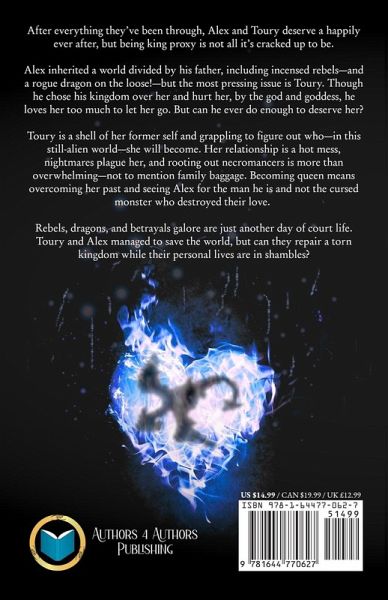 After everything they've been through, Alex and Toury deserve a happily ever after, but being king proxy is not all it's cracked up to be. Alex inherited a world divided by his father, including incensed rebels-and a rogue dragon on the loose!-but the most pressing issue is Toury. Though he chose his kingdom over her and hurt her, by the god and goddess, he loves her too much to let her go. But can he ever do enough to deserve her? Toury is a shell of her former self and grappling to figure out who-in this still-alien world-she will become. Her relationship is a hot mess, nightmares plague her, and rooting out necromancers is more than overwhelming-not to mention family baggage. Becoming queen means overcoming her past and seeing Alex for the man he is and not the cursed monster who destroyed their love. Rebels, dragons, and betrayals galore are just another day of court life. Toury and Alex managed to save the world, but can they repair a torn kingdom while their personal lives are in shambles? Authors 4 Authors Content Rating This title has been rated 17+, appropriate for older teens and adults, and contains:Brief sex Frequent graphic kissing Graphic violence Moderate language Frequent negative alcohol use Moderate fantasy drug use Indecent assault Domestic violence Discussions of rape For more information on our rating system, please, visit Authors4AuthorsPublishing.com/books/ratings