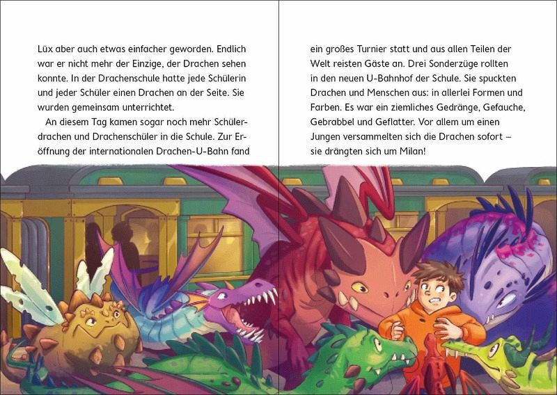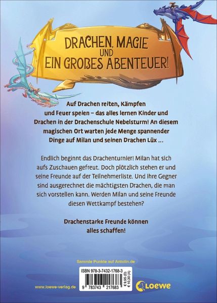 Drachen, Magie und ein großes Abenteuer! Auf Drachen reiten, Kämpfen und Feuer speien - das alles lernen Kinder und Drachen in der Drachenschule Nebelsturm! An diesem magischen Ort warten jede Menge spannender Dinge auf Milan und seinen Drachen Lüx ... Endlich beginnt das Drachenturnier! Milan hatte sich aufs Zuschauen gefreut. Doch plötzlich stehen er und seine Freunde auf der Teilnehmerliste. Und ihre Gegner sind ausgerechnet die mächtigsten Drachen, die man sich vorstellen kann. Werden Milan und seine Freunde diesen Wettkampf bestehen? Drachenstarke Freunde können alles schaffen!…mehr