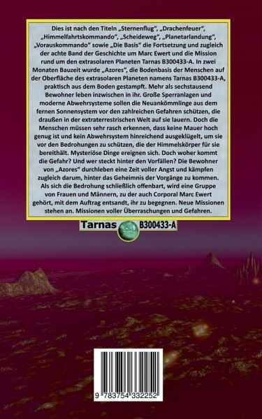 Dies ist nach den Titeln Sternenflug, Drachenfeuer, Himmelfahrtskommando, Scheideweg, Planetarlandung, Vorauskommando sowie Die Basis die Fortsetzung und zugleich der achte Band der Geschichte um Marc Ewert und die Mission rund um den extrasolaren Planeten Tarnas B300433-A. In zwei Monaten Bauzeit wurde Azores, die Bodenbasis der Menschen auf der Oberfläche des extrasolaren Planeten namens Tarnas B300433-A, praktisch aus dem Boden gestampft. Mehr als sechstausend Bewohner leben inzwischen in ihr. Große Sperranlagen und moderne Abwehrsysteme sollen die Neuankömmlinge aus dem fernen Sonnensystem vor den zahlreichen Gefahren schützen, die draußen in der extraterrestrischen Welt auf sie lauern. Doch die Menschen müssen sehr rasch erkennen, dass keine Mauer hoch genug ist und kein Abwehrsystem hinreichend ausgeklügelt, um sie vor den Bedrohungen zu schützen, die der Himmelskörper für sie bereithält. Mysteriöse Dinge ereignen sich. Doch woher kommt die Gefahr? Und wer steckt hinter denVorfällen? Die Bewohner von Azores durchleben eine Zeit voller Angst und kämpfen zugleich darum, hinter das Geheimnis der Vorgänge zu kommen. Als sich die Bedrohung schließlich offenbart, wird eine Gruppe von Frauen und Männern, zu der auch Corporal Marc Ewert gehört, mit dem Auftrag entsandt, ihr zu begegnen. Neue Missionen stehen an. Missionen voller Überraschungen und Gefahren.