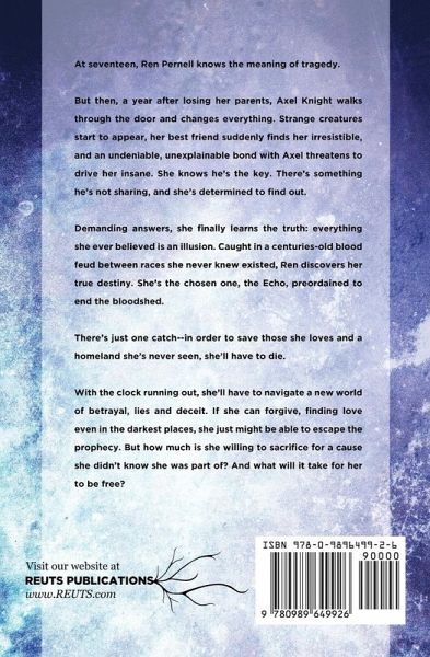 At seventeen, Ren Pernell knows the meaning of tragedy. But then, a year after losing her parents, Axel Knight walks through the door and changes everything. Strange creatures start to appear, her best friend suddenly finds her irresistible, and an undeniable, unexplainable bond with Axel threatens to drive her insane. She knows he's the key. There's something he's not sharing, and she's determined to find out. Demanding answers, she finally learns the truth: everything she ever believed is an illusion. Caught in a centuries-old blood feud between races she never knew existed, Ren discovers her true destiny. She's the chosen one, the Echo, preordained to end the bloodshed. There's just one catch--in order to save those she loves and a homeland she's never seen, she'll have to die. With the clock running out, she'll have to navigate a new world of betrayal, lies and deceit. If she can forgive, finding love even in the darkest places, she just might be able to escape the prophecy. But how much is she willing to sacrifice for a cause she didn't know she was part of? And what will it take for her to be free?