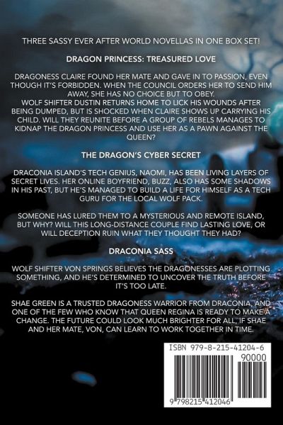 Dragon Princess: Treasured Love Dragoness Claire found her mate and gave in to passion, even though it's forbidden. When the council orders her to send him away, she has no choice but to obey. Wolf shifter Dustin returns home to lick his wounds after being dumped, but is shocked when Claire shows up carrying his child. Will they reunite before a group of rebels manages to kidnap the dragon princess and use her as a pawn against the queen? The Dragon's Cyber Secret Draconia island's tech genius, Naomi, has been living layers of secret lives. Her online boyfriend, Buzz, also has some shadows in his past, but he's managed to build a life for himself as a tech guru for the local wolf pack. Someone has lured them to a mysterious and remote island, but why? Will this long-distance couple find lasting love, or will deception ruin what they thought they had? Draconia Sass Wolf shifter Von Springs believes the dragonesses are plotting something, and he's determined to uncover the truth before it's too late. Shae Green is a trusted dragoness warrior from Draconia, and one of the few who know that Queen Regina is ready to make a change. The future could look much brighter for all, if Shae and her mate, Von, can learn to work together in time.