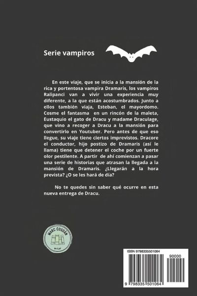 En este viaje, que se inicia a la mansión de la rica y portentosa vampira Dramaris, los vampiros Ralipanci van a vivir una experiencia muy diferente, a la que están acostumbrados. Junto a ellos también viaja, Esteban, el mayordomo. Cosme el fantasma en un rincón de la maleta, Eustaquio el gato de Dracu y madame Draculage, que vino a recoger a Dracu a la mansión para convertirlo en Youtuber. Pero antes de que eso llegue, su viaje tiene ciertos imprevistos. Dracore el conductor, hijo postizo de Dramaris (así le llama) tiene que detener el coche por un fuerte olor pestilente. A partir de ahí comienzan a pasar una serie de historias que atrasan la llegada a la mansión de Dramaris. ¿Llegarán a la hora prevista? ¿O se les hará de día? Una colección de vampiros pensada para el disfrute familiar, con lectura recomendada a partir de 8 años. ¡No te quedes sin el tuyo! Y descubre esta divertida familia vampira que va a darte más de una sorpresa. Eso está asegurado. Los libros son independientes, aunque la obra está desarrollada en una trama, que sigue desde el volumen uno y sucesivos.