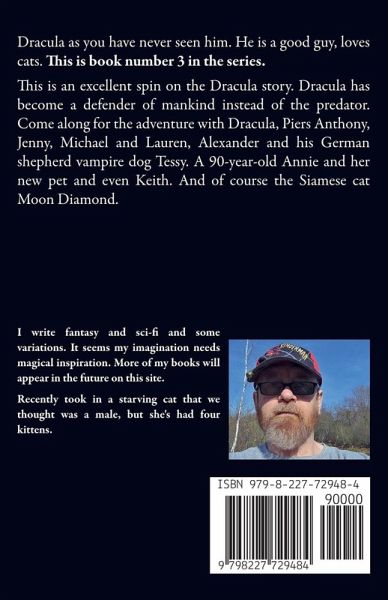 Dracula as you have never seen him. He is a good guy, loves cats. This is book number 3 in the series. This is an excellent spin on the Dracula story. Dracula has become a defender of mankind instead of the predator. Come along for the adventure with Dracula, Piers Anthony, Jenny, Michael and Lauren, Alexander and his German shepherd vampire dog Tessy. A 90-year-old Annie and her new pet and even Keith. And of course the Siamese cat Moon Diamond.