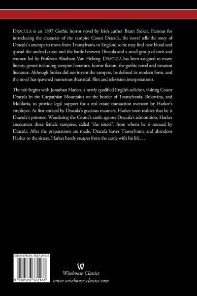 DRACULA is an 1897 Gothic horror novel by Irish author Bram Stoker. Famous for introducing the character of the vampire Count Dracula, the novel tells the story of Dracula's attempt to move from Transylvania to England so he may find new blood and spread the undead curse, and the battle between Dracula and a small group of men and women led by Professor Abraham Van Helsing. DRACULA has been assigned to many literary genres including vampire literature, horror fiction, the gothic novel and invasion literature. Although Stoker did not invent the vampire, he defined its modern form, and the novel has spawned numerous theatrical, film and television interpretations. The tale begins with Jonathan Harker, a newly qualified English solicitor, visiting Count Dracula in the Carpathian Mountains on the border of Transylvania, Bukovina, and Moldavia, to provide legal support for a real estate transaction overseen by Harker's employer. At first enticed by Dracula's gracious manners, Harker soon realizes that he is Dracula's prisoner. Wandering the Count's castle against Dracula's admonition, Harker encounters three female vampires, called "the sisters", from whom he is rescued by Dracula. After the preparations are made, Dracula leaves Transylvania and abandons Harker to the sisters. Harker barely escapes from the castle with his life . . . (more on www.wisehouse-classics.com)