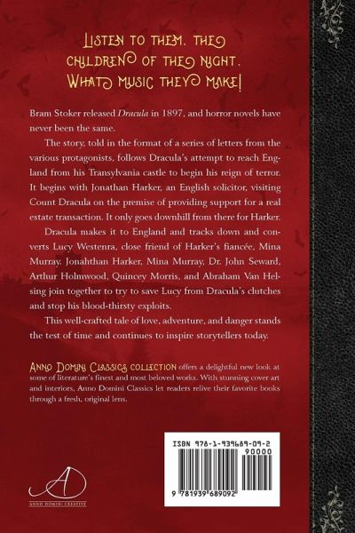Listen to them, the children of the night. What music they make! Bram Stoker released Dracula in 1897, and horror novels have never been the same. The story, told in the format of a series of letters from the various protagonists, follows Dracula's attempt to reach England from his Transylvania castle to begin his reign of terror. It begins with Jonathan Harker, an English solicitor, visiting Count Dracula on the premise of providing support for a real estate transaction. It only goes downhill from there for Harker. Dracula makes it to England and tracks down and converts Lucy Westenra, close friend of Harker's fiancée, Mina Murray. Jonahthan Harker, Mina Murray, Dr. John Seward, Arthur Holmwood, Quincey Morris, and Abraham Van Helsing join together to try to save Lucy from Dracula's clutches and stop his blood-thirsty exploits. This well-crafted tale of love, adventure, and danger stands the test of time and continues to inspire storytellers today. Anno Domini Classics collection offers a delightful new look at some of literature's finest and most beloved works. With stunning cover art and interiors, Anno Domini Classics let readers relive their favorite books through a fresh, original lens.