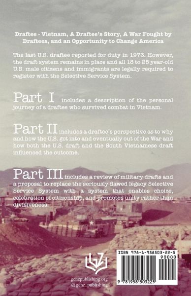 The last U.S. draftee reported for duty in 1973. However, the draft system remains in place and all 18 to 25 year-old U.S. male citizens and immigrants are legally required to register with the Selective Service System. Part I of Draftee includes a description of the personal journey of a draftee who survived combat in Vietnam. Part II includes a draftee's perspective as to why and how the U.S. got into and eventually out of the War and how both the U.S. draft and the South Vietnamese draft influenced the outcome. Part III includes a review of military drafts and a proposal to replace the seriously flawed legacy Selective Service System with a policy that enables choice, celebration of citizenship, and promotes unity rather than divisiveness.