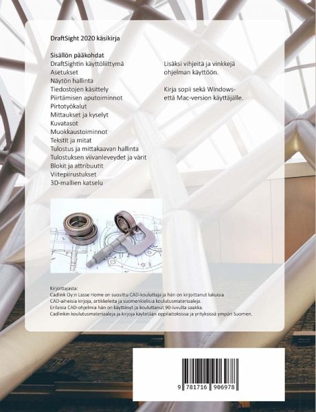 Mainio itseopiskeluopas 2D-CAD-piirtämisen aloittamiseen DraftSight-ohjelmalla. Sopii sekä kurssikäyttöön että päivittäisen työskentelyn tueksi. *** DraftSight-ohjeita ja vinkkejä kirjan täydennykseksi: cadlink.fi/draftsight *** Kirjan pääaiheet: - DraftSightin käyttöliittymä - Asetukset - Näytön hallinta - Tiedostojen käsittely - Piirtämisen aputoiminnot - Piirtotyökalut - Mittaukset ja kyselyt - Kuvatasot - Muokkaustoiminnot - Tekstit ja mitat - Koordinaatistot - Tulostus ja mittakaavan hallinta - Tulostuksen viivanleveydet ja värit - Blokit - Viitepiirustukset - 3D-mallien katselu sekä - vihjeitä ja vinkkejä ohjelman käyttöön. *** Kirja sopii sekä Windows- että Mac-version käyttäjille. ***